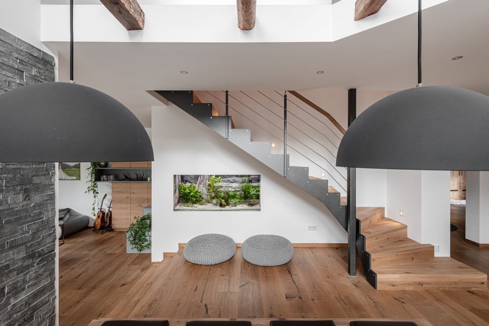 Stahlwangentreppe mit Edelstahl-Glasgeländer und Holzstufen Treppenmeister 684a